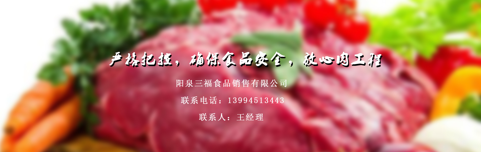 陽泉三福食品銷售有限公司成立于二零零六年九月,位于陽泉市城區(qū)桃南中路28號,資質(zhì)為一般納稅人,是政府批準的合法具有外調(diào)肉類的單位之一。在2012年獲得中國人民銀行頒發(fā)的AAA機構信用代碼證。現(xiàn)主要提供以下供貨渠道:     1、 冷鮮肉類的批發(fā)     2、 凍貨...